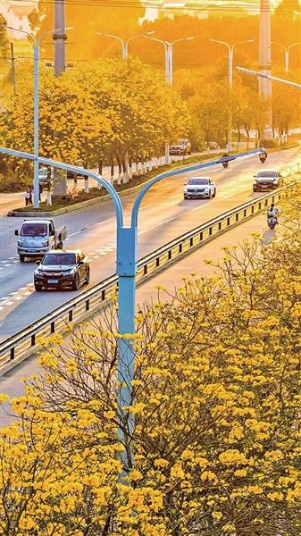 连日来,县城温泉西路两侧黄花风铃木迎春绽放,挺拔的枝干上挂满金灿灿的花朵,将整条街道装点成一条流动的“金色丝带”(如图)。 据悉,黄花风铃木又称黄金风铃木、黄钟木,因花黄色、形如风铃而得名,花期为每年3月-4月,随季节变化而风采各异。漫步温泉西路,放眼望去,满街金黄扑面而来,一簇簇、一团团的黄花缀满枝头,阳光穿透花瓣,为其镀上一层朦胧的光晕,与过往的车流、行人相映成趣,构成一幅绚丽多姿的春日画卷。 眼下,不只是温泉西路,在我县客山公园、木兰溪沿岸等地,黄花风铃木已进入盛花期,一抹抹耀眼的金黄肆意怒放,正以最灿烂的姿态邀请市民共赴这场春日之约。